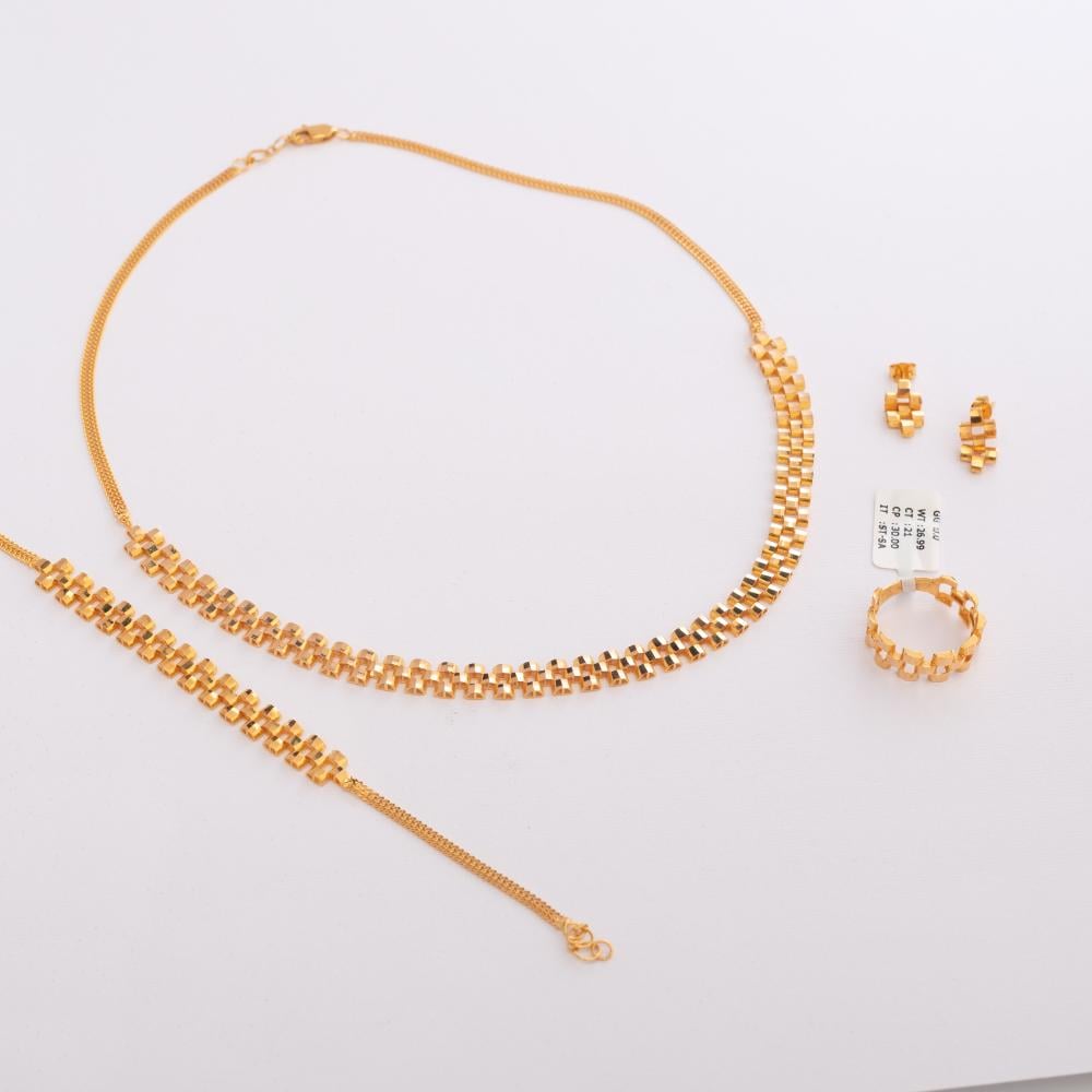 تألقي مع الطقم ذهب عيار 21 التي تجسد الفخامة والأصالة بلمسة من الفن الراقي. هذا الطقم تحفة فنية تعكس ذوقك الرفيع وجمالك الدائم